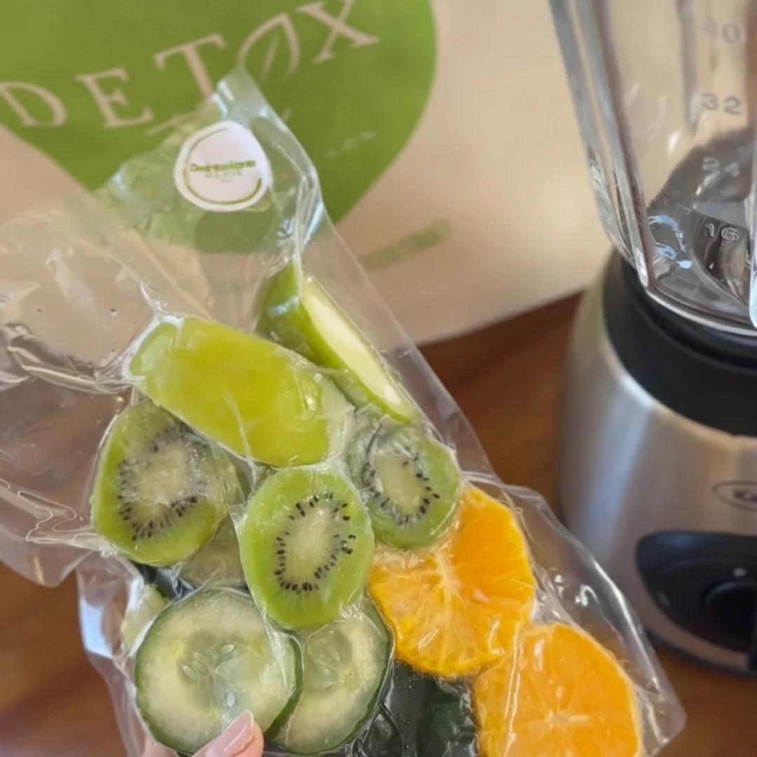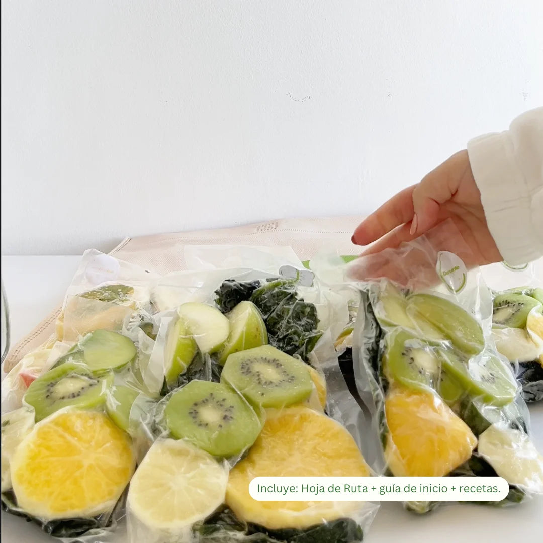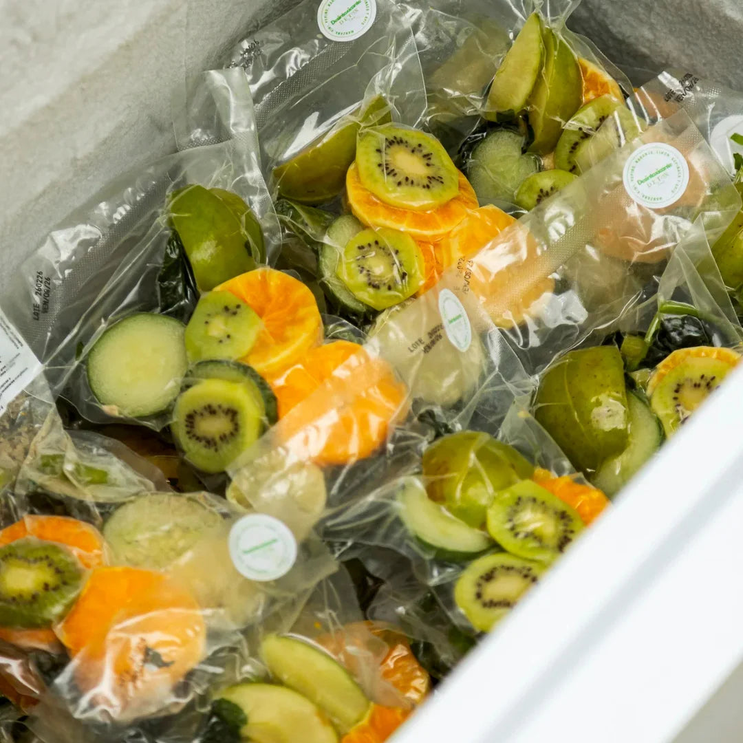Bolsitas individuales selladas al vacío. Adentro hay fruta y verdura real, lavada, troceada y congelada en su punto justo. Al estar al vacío, no generan escarcha (ese hielo molesto) y son chatitas, por lo que ocupan el mínimo espacio en tu freezer. Fruta real en pausa, lista para reactivar.